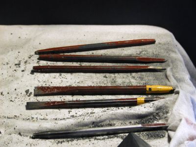 From the pulley system to the tools, and even down to the roaring fire, one is surrounded by all things moved or created by caring hands. Carbide-tip chisels lay beside a grinding stone which sharpens them to just the right edge for each cut into the stone. And, beside each workstation you can see the respective carver's favorite hand-worn mallet.